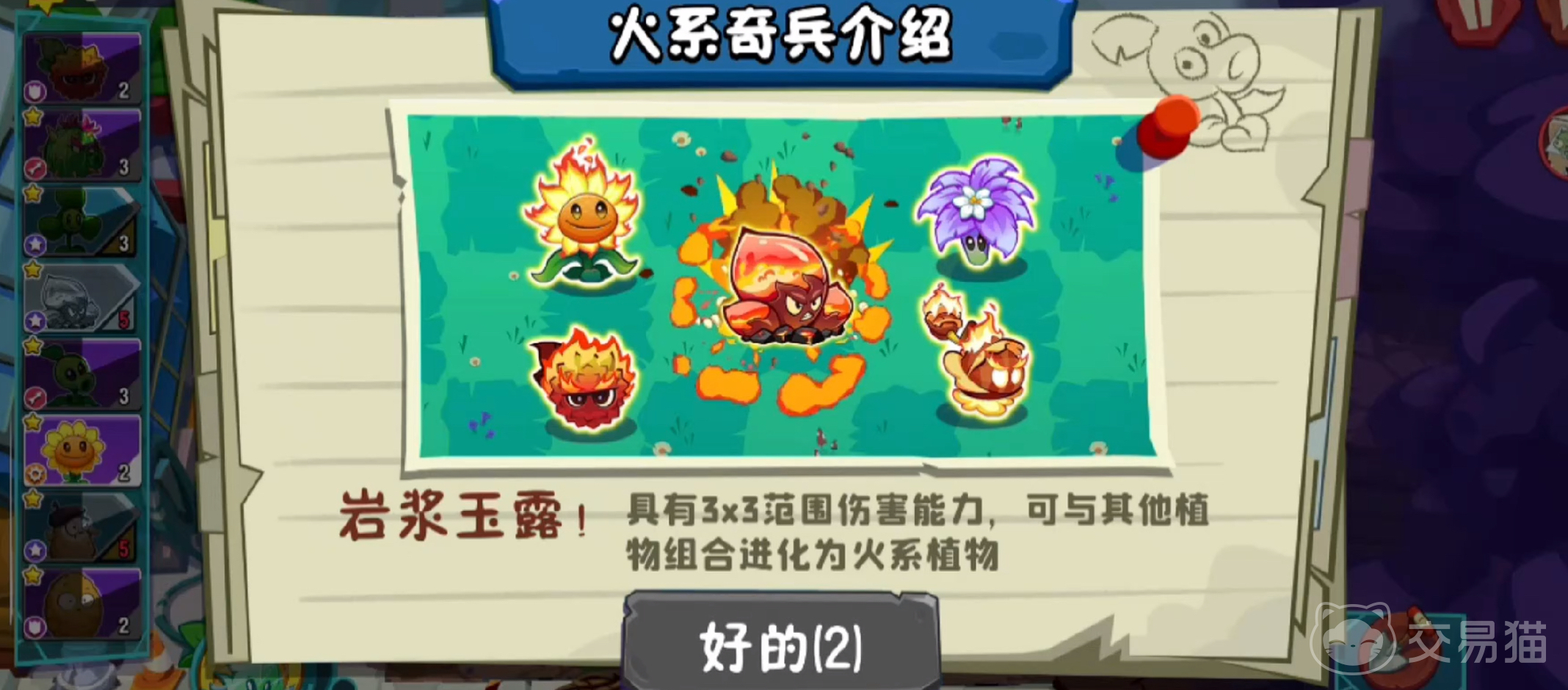 这样一来我们的思路就很清晰了,首先向日葵是必选的,因为我们需要向日葵来收集阳光,才能种植更多的植物。其次我们要选择火系植物,这里推荐岩浆玉露和熔岩荔枝,岩浆玉露不仅具备3×3的范围伤害能力,还可以和其他植物进行叠种,帮助其他植物进化为火系植物。熔岩荔枝本身就是火属性植物,可以将它们种植在前排,这样就可以完全克制住冰箱僵尸。