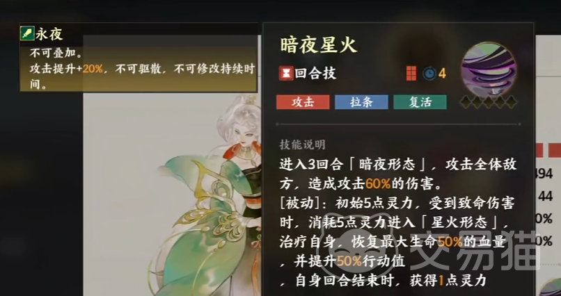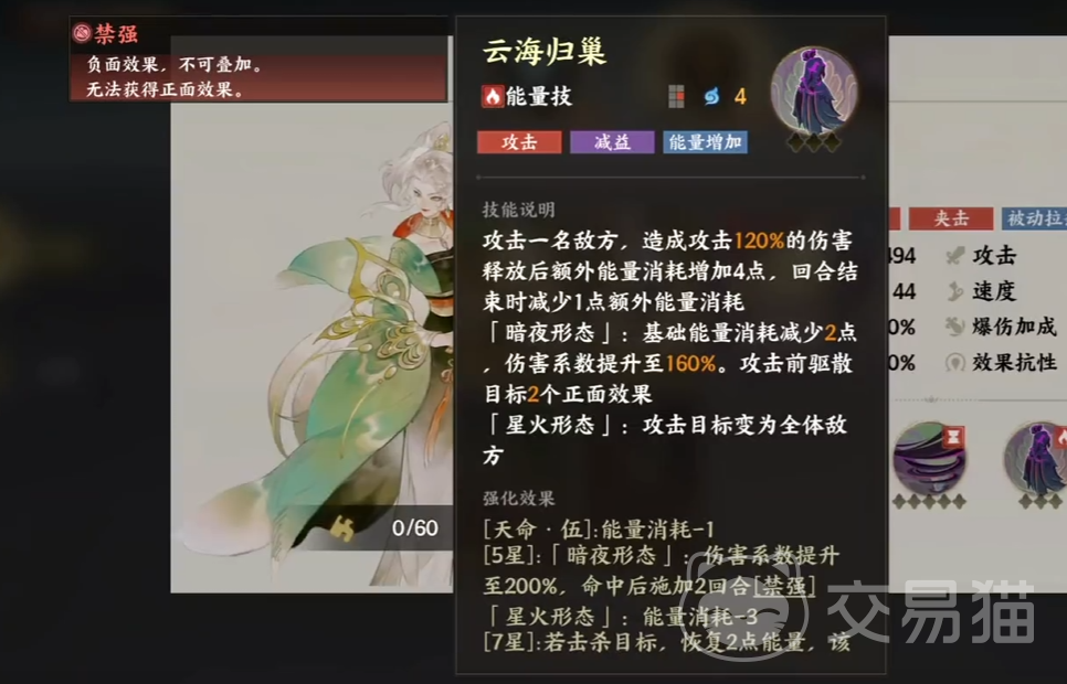能量技能云海归巢。可对敌方指定目标造成120%的伤害,但释放该技能之后,消耗的能量值额外增加4点,当回合结束之后,能量消耗减少一点。如果施展此技能是自身处于暗夜状态,则能量消耗减少两点。攻击提升至160%且驱散敌方两个正面buff。处于星火状态时,则技能可对敌方全体成员生效。