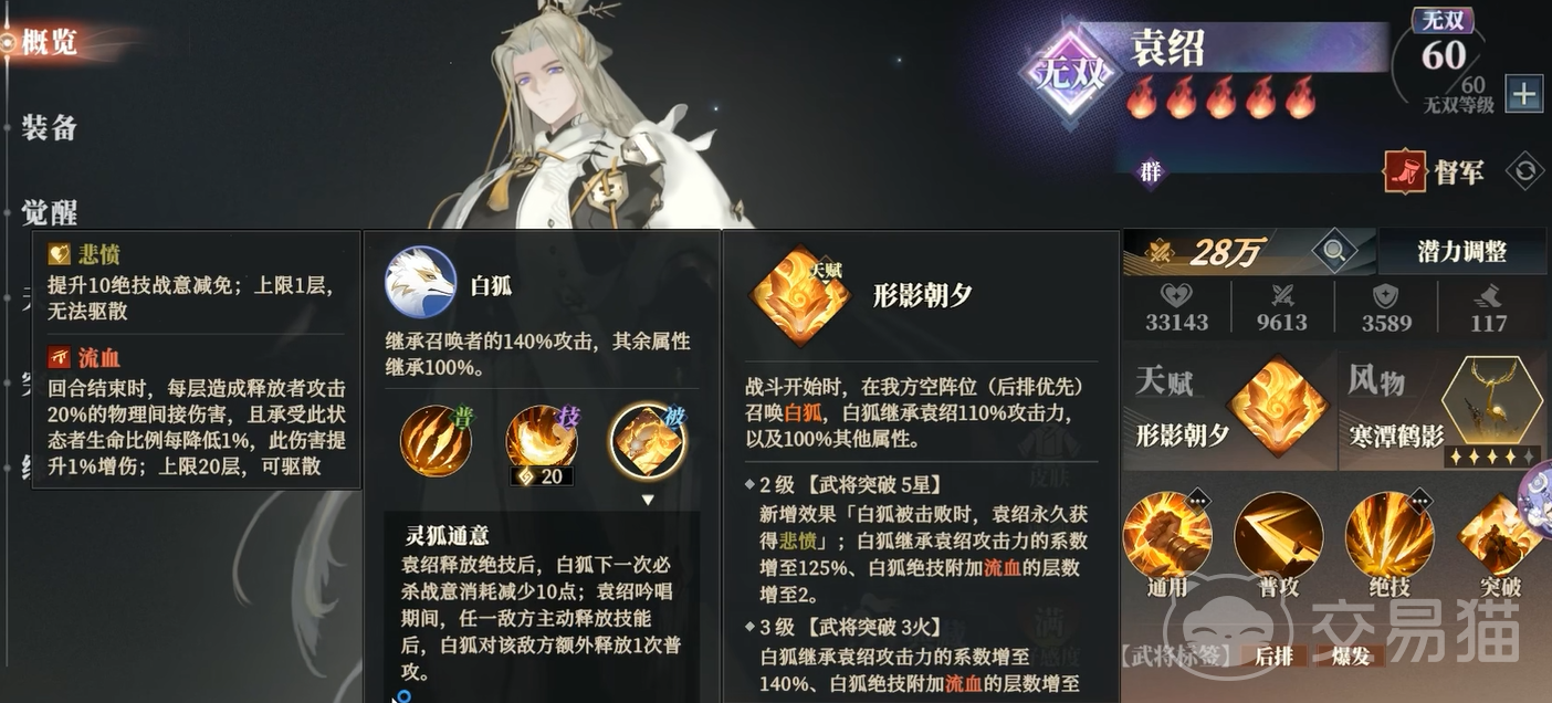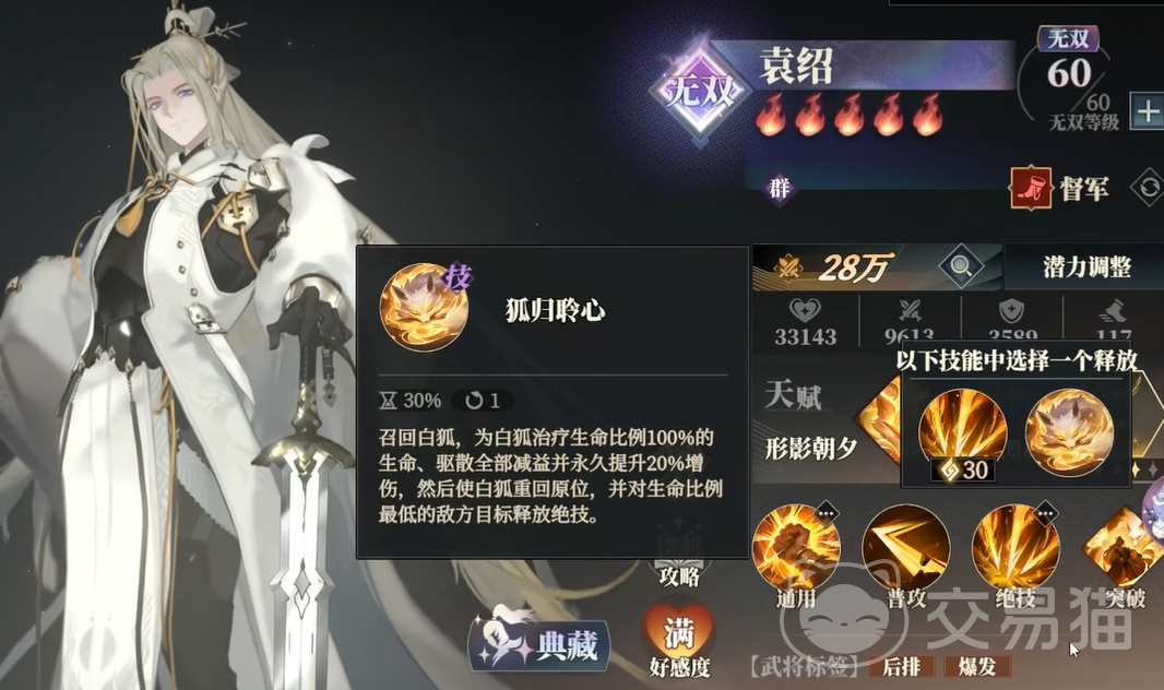 当然,袁绍的天赋也是不可忽视的部分。“形影朝夕”天赋让你在开局时就能召唤出白狐,这可不仅仅是个加成那么简单,白狐的属性直接继承自袁绍,能够和他形成强有力的配合。而且,如果白狐在战斗中被击败,还会导致袁绍的绝技战意消耗永久降低,这意味着,白狐不仅是个强力助手,也是一个可以让袁绍释放更多技能的“能源来源”。