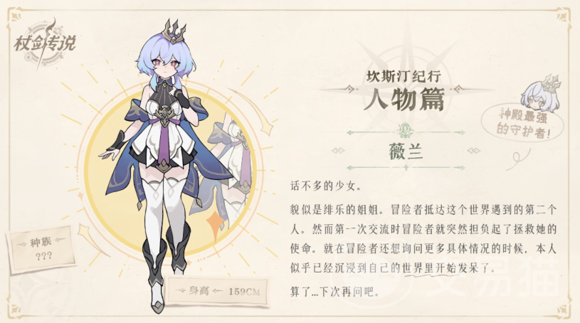 有很多玩家对于杖剑传说这款游戏中的薇兰这个npc比较感兴趣,那么今天的文章中小编就给大家带来了一篇简单的介绍,当小伙伴们把游戏的剧情推进到后期之后,薇兰与玩家们的羁绊也会更加深,因此对于这个角色感兴趣的玩家们,不妨来继续推进剧情吧。