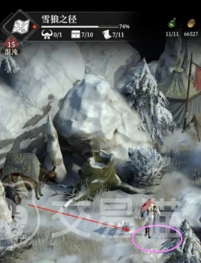 首先玩家要获取钥匙,可以前往地图右边商人附近,在粉色圈标注的位置有个土堆,花费一定金币购买铲子,挖开土堆即可得到雪狼之径门的钥匙,这是进入后续区域的关键道具,务必尽早获取,流浪者营地有两个选项,营地外搜索和进入营地,先选择进入营地,会触发战斗,战胜后可获得一些物资,接着选择营地外搜索,完成后会发现还能再次进入营地,又会触发一场战斗,再次获胜可获得额外物资,按此顺序操作,能充分搜刮营地资源,留意隐藏事件,地图中有个石头需要砸掉,这也是一个隐藏事件,不要错过此类细节,完成隐藏事件往往能获得独特奖励,对后续冒险有很大帮助。