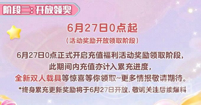 首先要提到的,当然是这次周年庆活动中最具吸引力的福利环节——充值返利。活动分为两大阶段,不仅让玩家在短期内体验到了丰厚的奖励,也巧妙地借助了“延迟满足”的心理,激发了玩家的参与热情。第一个阶段是预充值期(6月6日-6月26日),只要你在这个时间段充值,就能得到100%的充值返利,并且额外获得一个限定表情《惊喜礼物》。虽然这款表情并不会提升你的角色属性,但借着动态特效,它一定能成为你在社交平台上的亮眼话题。而等到第二阶段,大家可以在6月27日到7月10日期间领取奖励,累计充值30元就能解锁一款限定的双人载具“糖果热气球”。这辆载具不仅有着甜蜜的糖果特效,还需要两个人协作才能控制它,完全符合情侣或朋友间的互动需求。