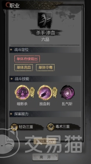 在队伍阵容中选择了刺客的话还能帮助主角增加轻功能力和毒术相关的秘术技能,在后续的职业转职中刺客职业的角色最高能转职成为杀手职业,能在战斗过程中有更为强力的技能输出效果。