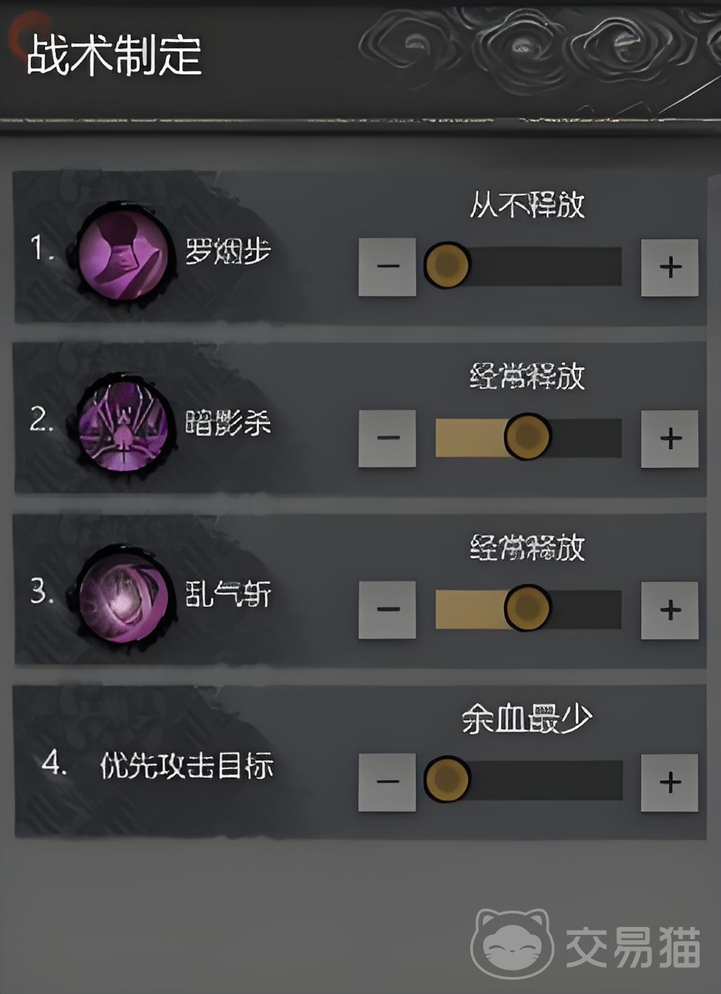 刺客的职业技能有【罗烟步】、【暗影杀】、【乱气斩】等。罗烟步技能提高轻功效果和闪避效果,暗影杀技能提高伤害数值和一定的中毒概率,乱气斩是提高攻击速度和攻击伤害的技能。在后续的在选择刺客上阵后还能优先针对场上血量较少的目标进行攻击。