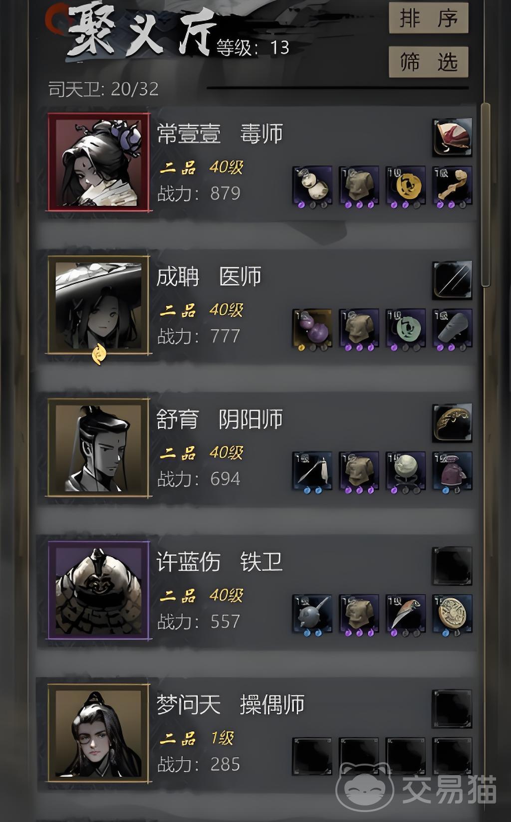 在游戏初始阶段玩家通过招募的方式只能招募到刺客、力士、医师这样的职业角色,而且基本上都是蓝色品质或者是绿色品质的角色,想要获得毒师这样的职业角色,是需要玩家将聚义堂的等级升级到一定阶段后才有可能招募到毒师这样的角色。在众多的毒师角色中最为推荐的是【常壹壹】这个角色。