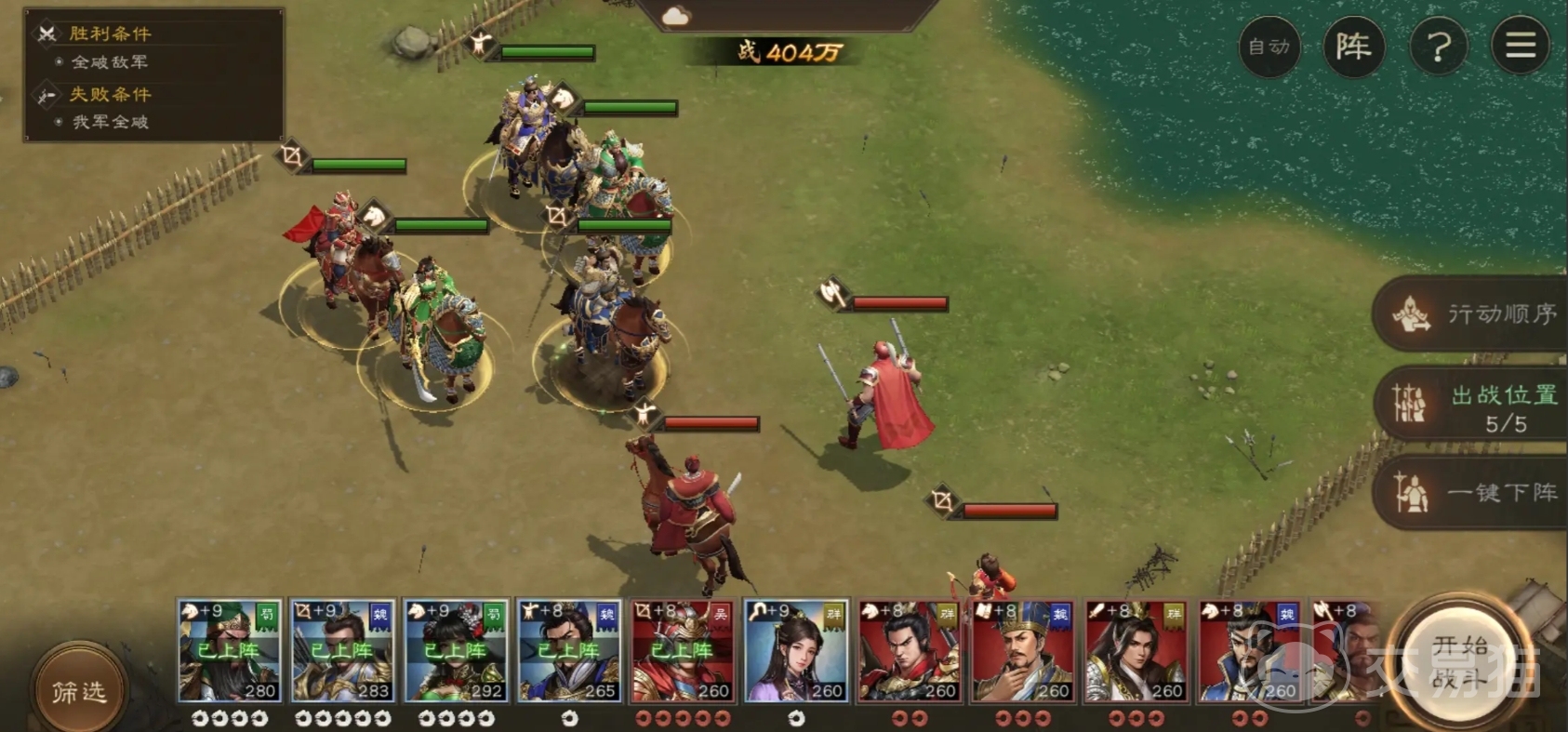 最后阵容中加一个吕布,吕布的力量、统率以及敏捷性皆为游戏中的一流水准,这也使得他具备了高攻击、高防御、高暴击以及暴力攻击的能力,当然他相对较低的智力方面存在一定的缺陷,基于这些特点,在为他搭配装备时,方天画戟、白银铠与赤兔马的组合堪称完美,吕布的飞将技能使其在初始时便能够攻击八格位置,所以方天画戟的使用能够将他的攻击范围最大化,使其在战场上能够对敌人造成大面积的打击。