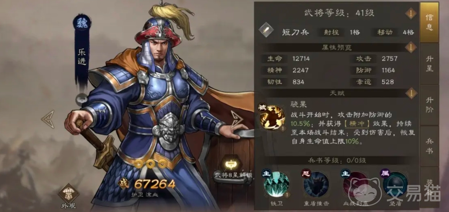 乐进,在曹操阵营中,与他一同作为步兵代表的还有李典、曹洪等,而在众多人选之中,之所以选择乐进作为主要培养的步兵对象,是因为他在三人之中初始统率相对较高,众所周知,步兵作为战斗队伍中的前排主力,承担着抗伤害的重要职责,而统率越高,意味着防御力越强,在为乐进搭配宝物时,玄铁双鞭、雁翎锁子甲与青囊书的组合堪称经典。