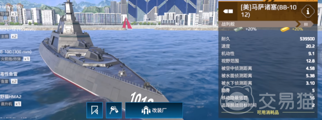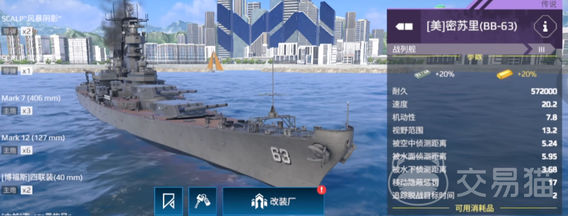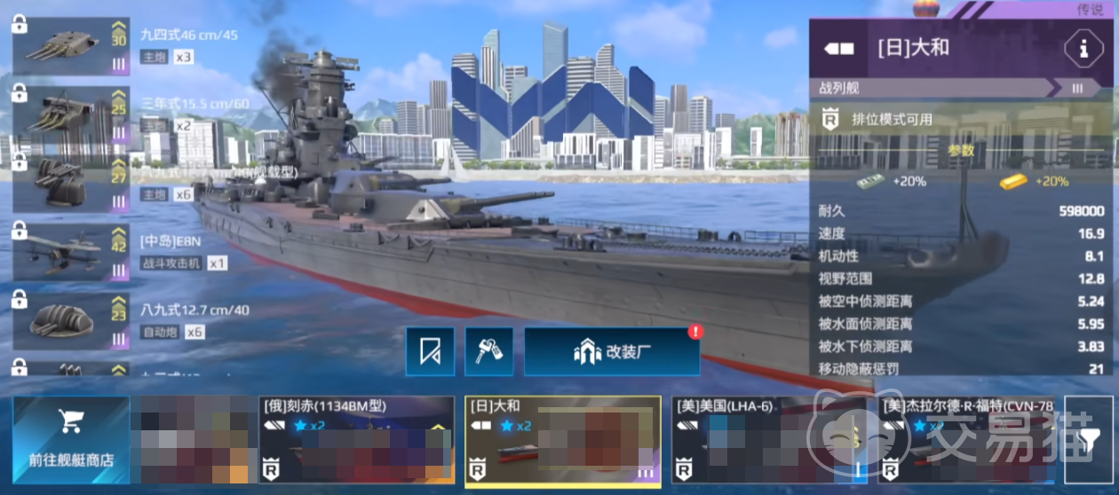 消耗品同样是电子对抗,增强生存。马萨最大的优势在于武器配置的全面性:拥有三种导弹系统(高抛型),适合卡山打法,配合激光制导精准打击远程目标。主武器是四门155mm电磁炮,虽非传统战列主炮,但射速、弹速和精度极高,瞄准速度也比大和和密苏里更快,一轮输出可达10万上下。