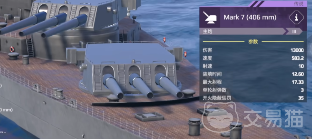 主炮为九门406mm MK7,精度良好,具备暴击能力,一轮输出在12万至14万间,伤害波动大但总体稳定,12秒装填节奏不错,使用手感优于大和。副武器是12门127mm速射炮,射速快、弹速佳,但无暴击,整体伤害达5万上下。其余防空与自动炮作为辅助火力。
