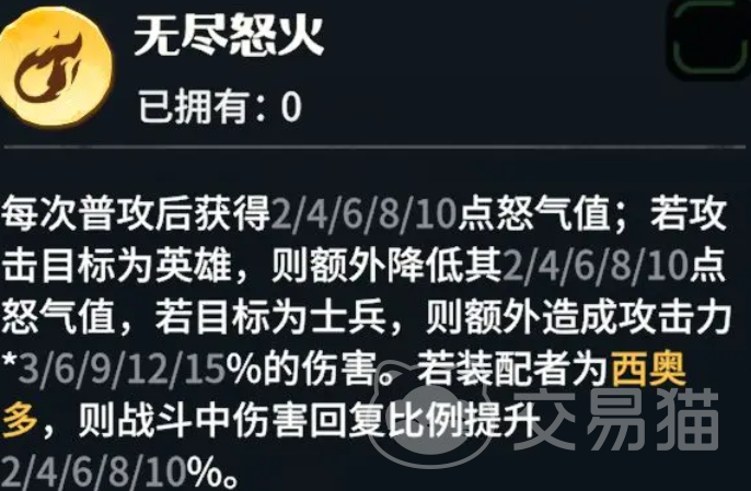 防御则是能带来生命数值,或者是伤害减免,都和防御相关,回复类也同样是让回复量增加的类型,最后的全能就是回怒气的,能帮助英雄快速释放怒气技,适合所有流派。