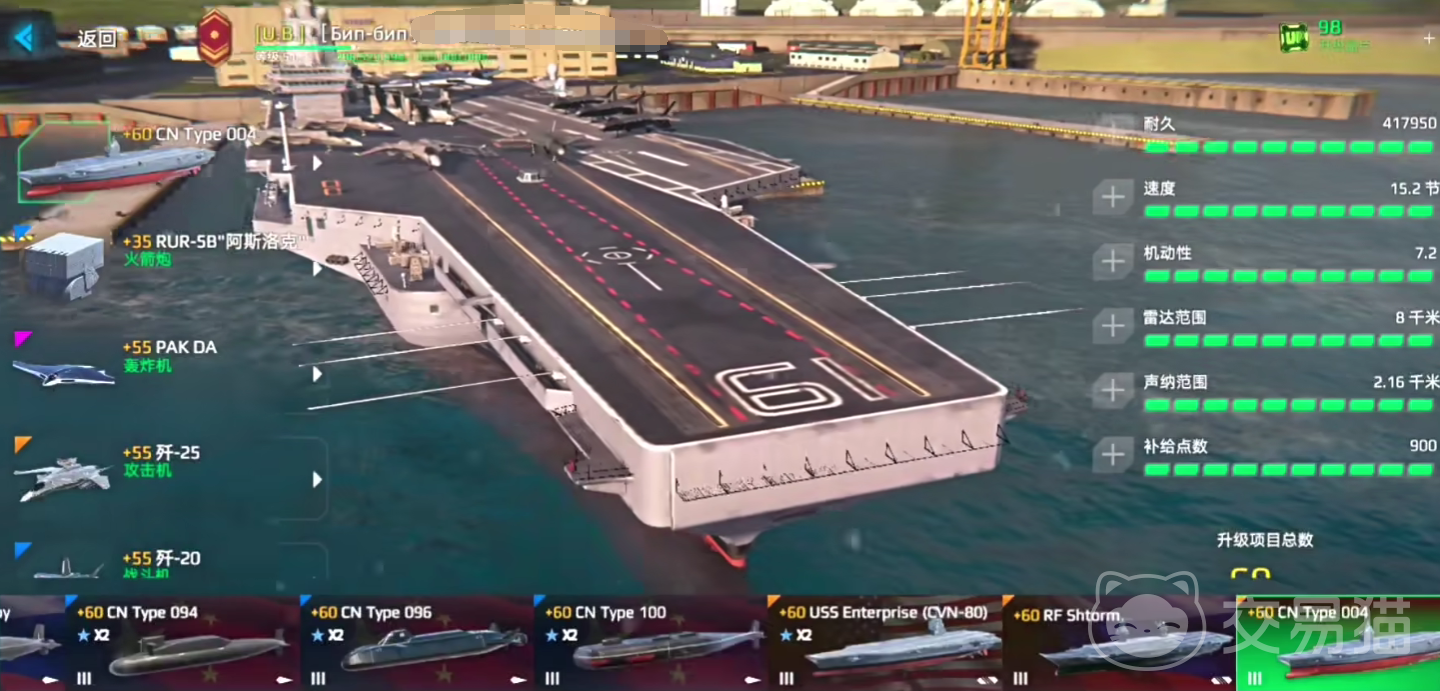 其次强度比较高的航母,是游戏当中的004型核动力航母,它属于电磁弹射器的航母类型,拥有极强的突击能力,防空方面的设计,能够保证它很难被敌方干扰,斜角甲板双弹插槽面板,可以使战机双边出动,效率极高,甚至超越了福建舰航母。