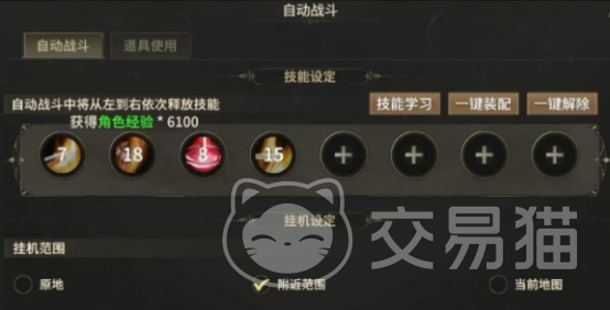 如果在技能选择这方面并不是特别了解,不用担心,可以根据当前的实际情况选择一键装配,这样会更加省心。在挂机方面共拥有多项内容,包括挂机范围是否自动反击,是否自动普通攻击等等。在众多功能当中,小编建议一定要选择附近范围,这样即可在附近打怪并不会超出特定区域。