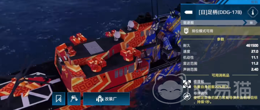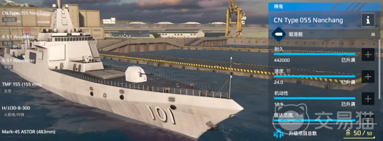 首先是当前版本最为推荐的驱逐舰:055型驱逐舰。这艘船凭借其全能型设计成为新手首选,拥有高达44万的耐久,与部分战列舰相当,速度快、机动性优秀,同时配备火箭炮与鱼雷,具备不俗的对舰打击与自保能力。其防空能力也相当可靠,加上赠送的海景涂装,性价比极高,几乎是新手阶段最全面的选择。