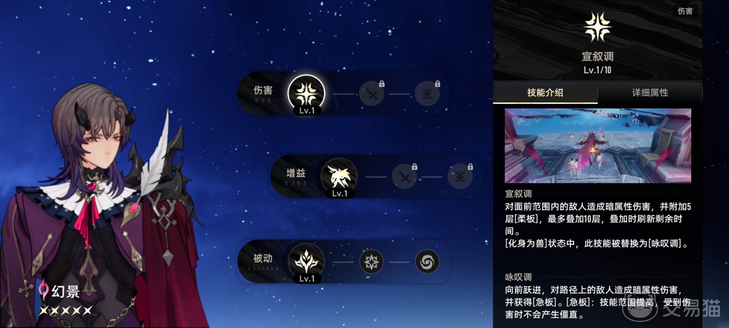 幻景的输出结构以柔板-沉浸度-爆发三者为基础。人形状态下,使用主动技“宣叙调”对敌方叠加[柔板],最多10层,并刷新持续时间。柔板不直接造成伤害,但会在兽形态下作为加成依据触发[休止符]造成倍率增伤,并移除柔板,为爆发提供触发条件。
