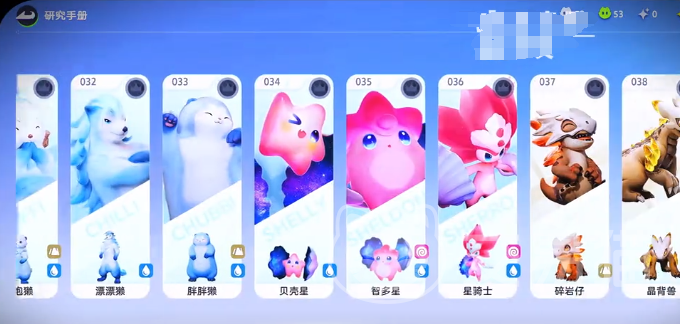 玩家在打开研究手册之后就可以看到各种不同属性的伊莫,其中会包括水系草系,还有火系等等,甚至还会有一些比较独有的属性类别。