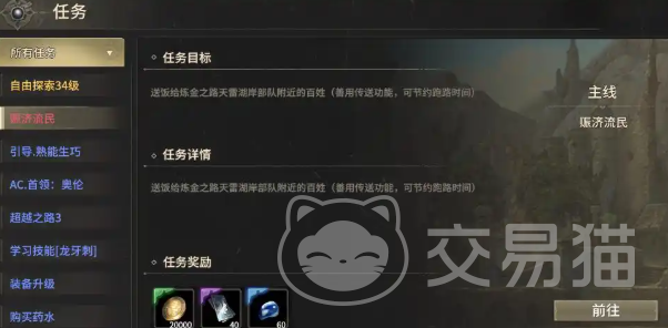 首先和米尔对话接取任务,该任务是分为两个不同阶段的,第一阶段是给天雷湖岸部队附近百姓送饭,我们接取后点击地图,直接传送到炼金之路,并通过湖边上的桥梁过去,就能湖中的亭子内发现灾民。