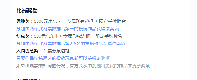 在比赛之后,玩家就可以有机会获得奖励,优胜奖是5000元的京东卡,限定的手牌牌背,还有专属的形象框。创意奖是500元的京东卡,还有专属的形象边框。还有一个入围的创意奖是一个专属的形象边框,只要是作品通过审核,所有的玩家都可以获取。