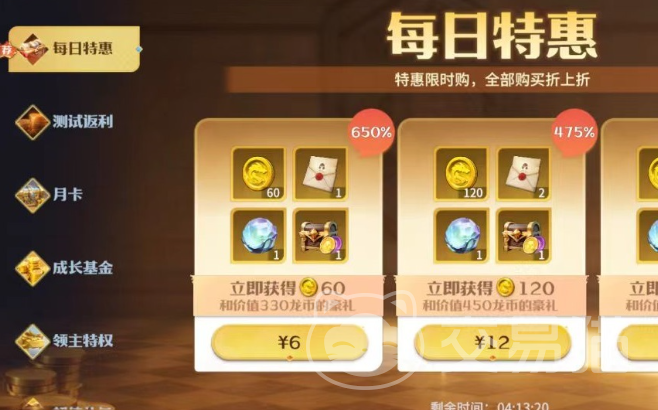 最后就是商城中的每日特惠板块。该板块中所出售的物品一共有4样,分别为招募券、龙币、抽奖和幸运宝箱,根据价格的不同,所包含的数量也会有所区别,不过全部都是相当划算的,同样也是非常推荐各位购买。