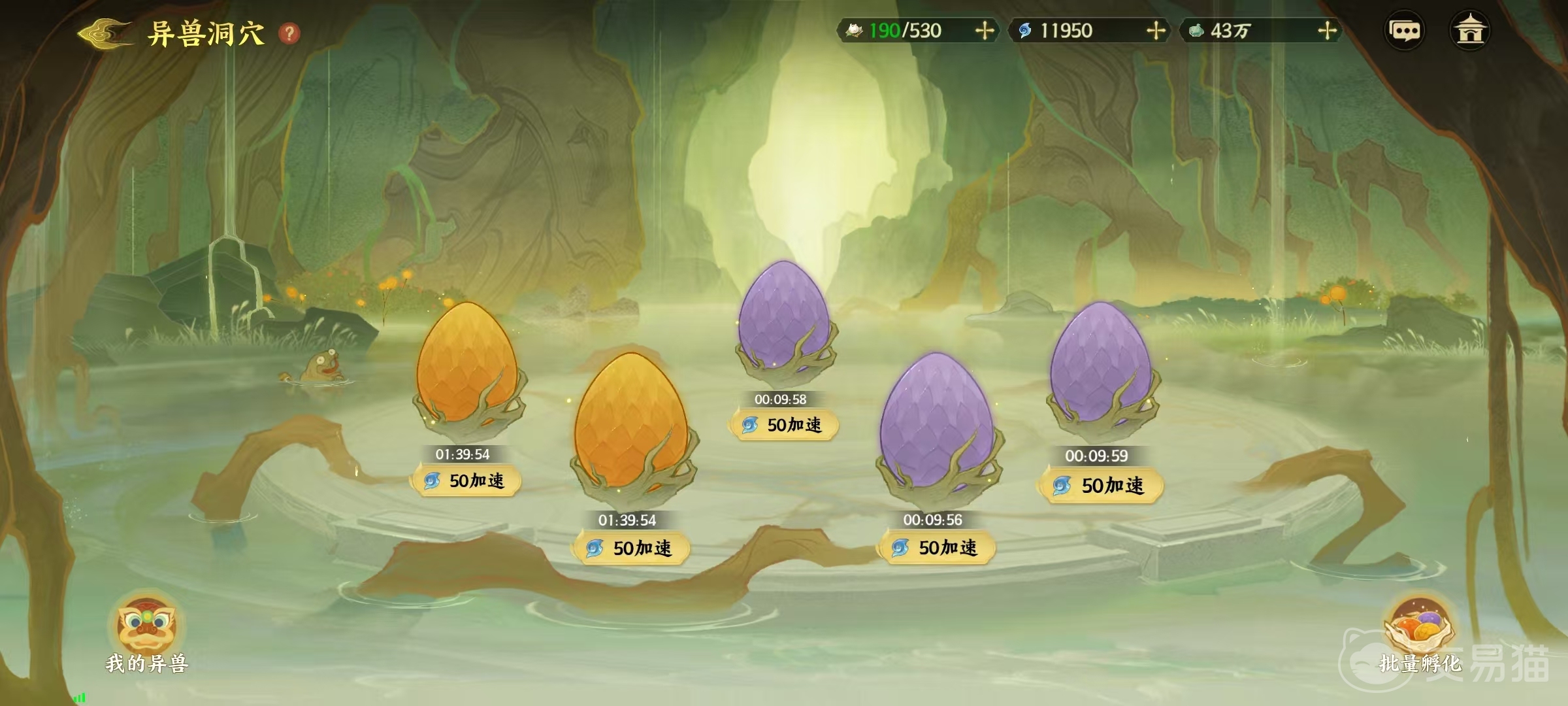 这款游戏中的异兽功能,其实是和神树功能所绑定在一起的,大家只有在开通了生命之树之后,才能够解锁对应的异兽玩法。点击生命之树之后,就可以看到有异兽洞穴,这里面就是大家获得异兽的关键所在。获得异兽最重要的就是异兽蛋,获取到异兽蛋之后,在洞穴中可以进行孵化,最多同时孵化5枚异兽蛋。玩家可以点击批量孵化,然后在这里批量选中自己所具有的异兽蛋,就可以进行孵化了。