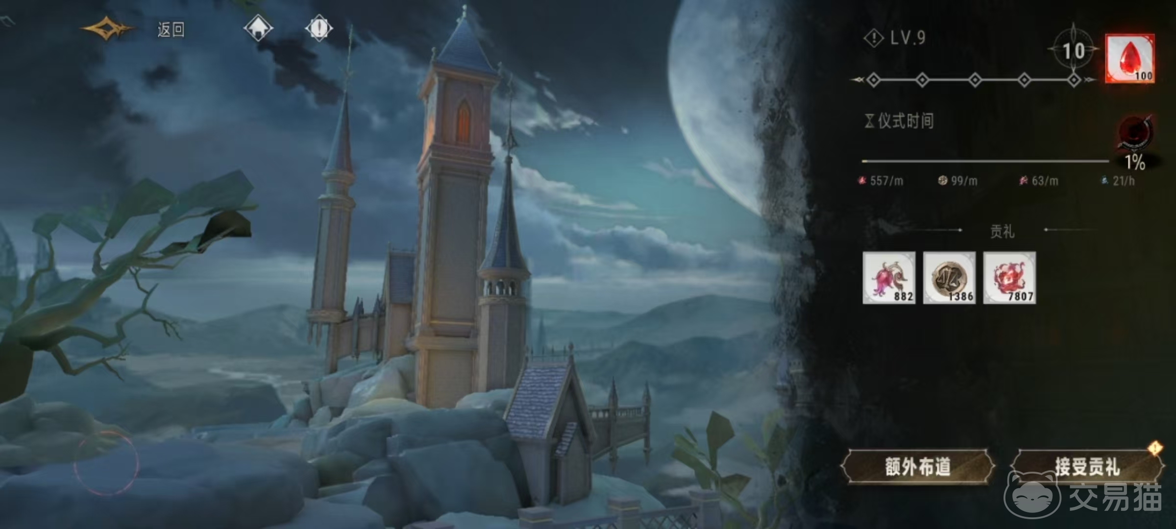 第5项功能是盈月贡礼,在主线中每累计5次通关剧情模式或者是困难模式关卡,盈月信念就能提升一级,然后能提升产出的贡礼数量,每天都可以进行额外的布道,通过额外布道,能够获得两小时的仪式时间基础资源和随机道具奖励。