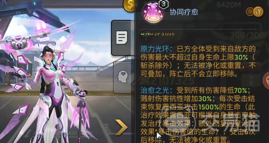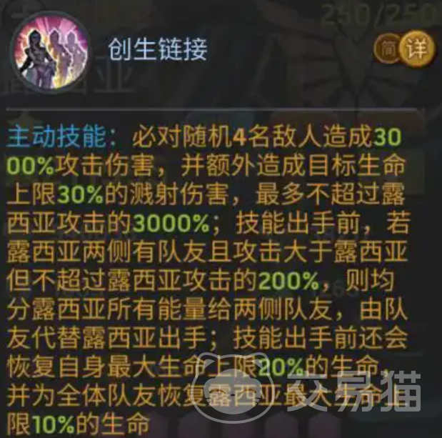 接着就是技能,原力光环是一个小无敌技能,此技能释放期间所有的伤害都无法进行秒杀,因为秒杀以后可以恢复自身的血量,只要对面的技能不是斩杀效果的话,都无法一回合内带走露西亚,可谓是提高了角色的容错率,并且该技能可以辐射到队友,能提供百分之10的治疗,也进一步提高了其他队友的生存率。