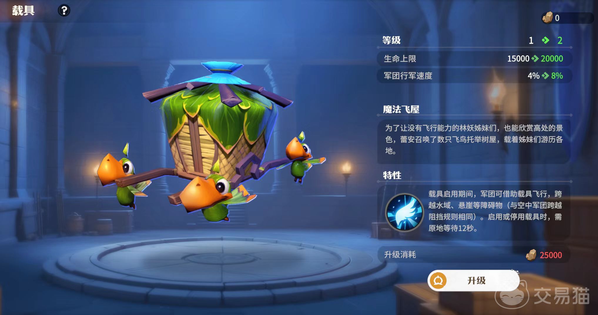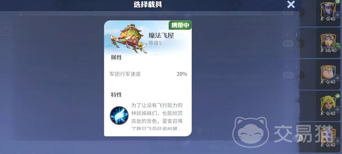 在军团携带完载具后,载具就会出现在军团的后方,这时整个军团可以享受到载具所提供的属性加成。在启用载具特性的持续时间之内,战斗单位会消失,只显示出载具。最后给大家介绍一个目前非常好用的载具魔法飞屋,这是古树新生剧本中可以使用的类型。特性是可以使陆地军团变为纯空军军团,行军时可以跨过一切地面障碍,这样的特性对于战斗有着非常重要的影响。