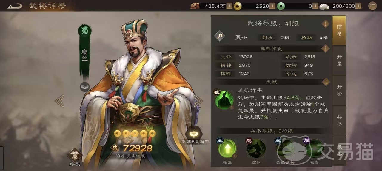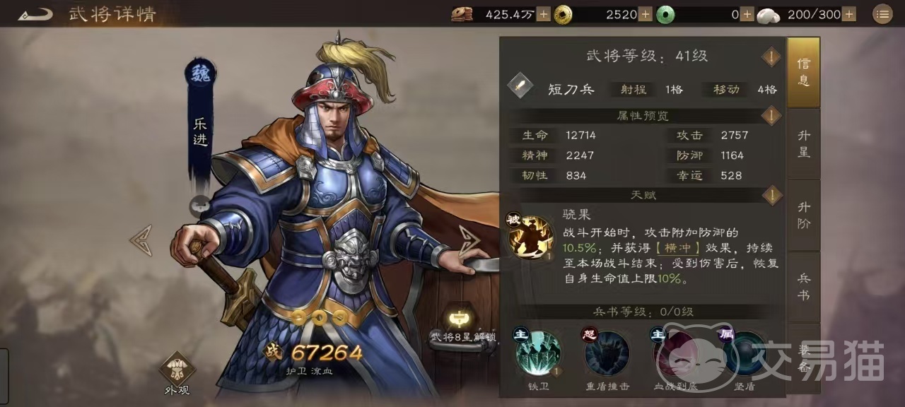 这两人一起搭配起来,先让糜竺走到前面去卖,然后乐进放技能去护卫糜竺,糜竺挨打的同时可以触发两个人的天赋,这样的搭配非常猛,几乎不会掉血。只要不是出场之后直接将二人秒掉,基本上是打不死的存在。获取难度低,前期过度非常合适,即使在后期,也是非常好的狗粮,所以不会浪费。