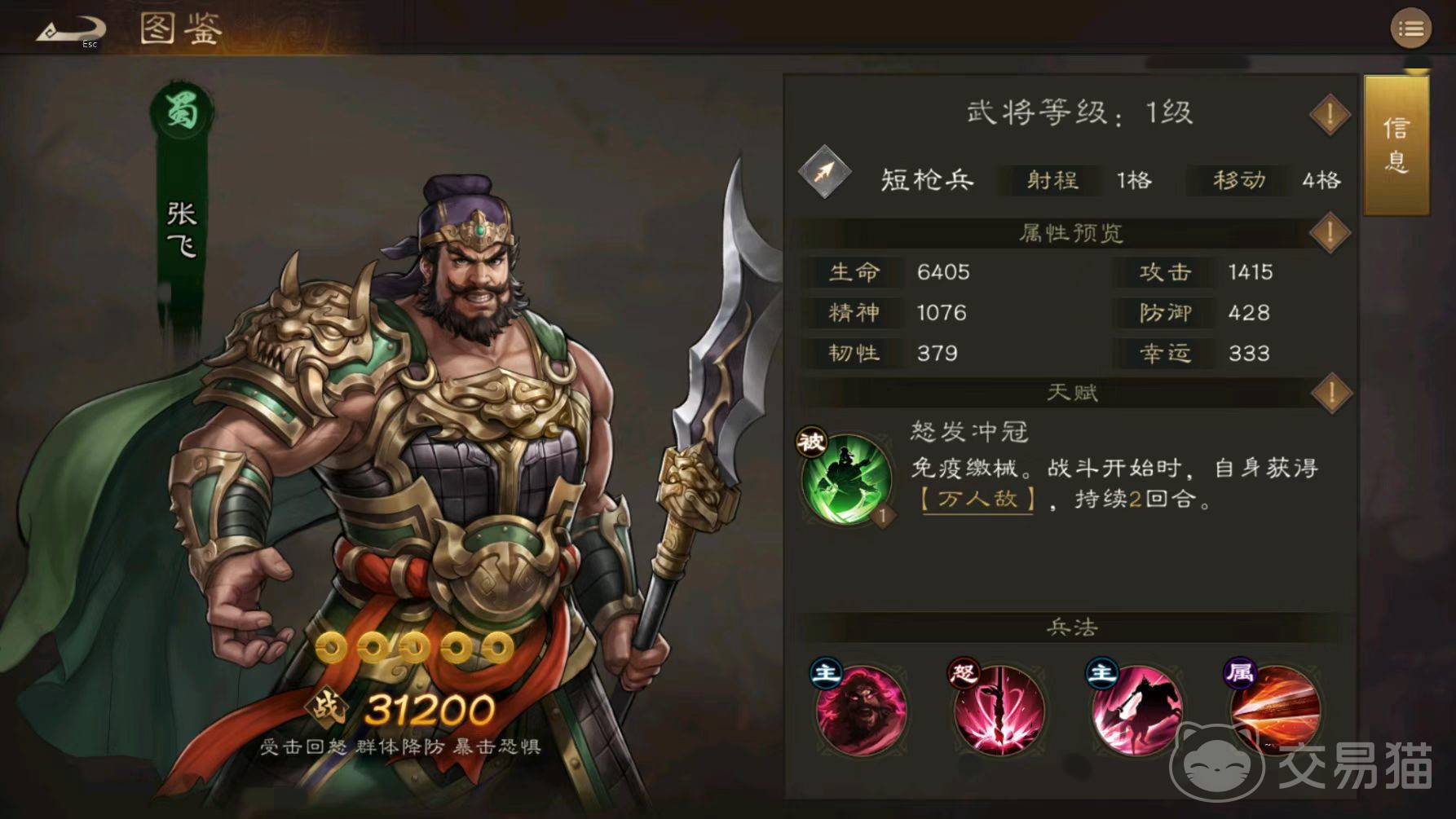 张飞在属性方面武力值接近满值,但其他方面比较低,尤其是智力非常差。率领的兵种特性是突刺,在战场中反击伤害提升,任何地形都不会降低战斗力,所以适合在一些其他兵种无法胜任的地形下作战,例如在建筑中也能发挥出优势。天赋怒发冲冠,能免疫缴械,兵刃减免效果和连击抗性大幅度提升,暴击伤害中幅度提升,受到伤害后能恢复50点怒气,此效果一回合触发一次。