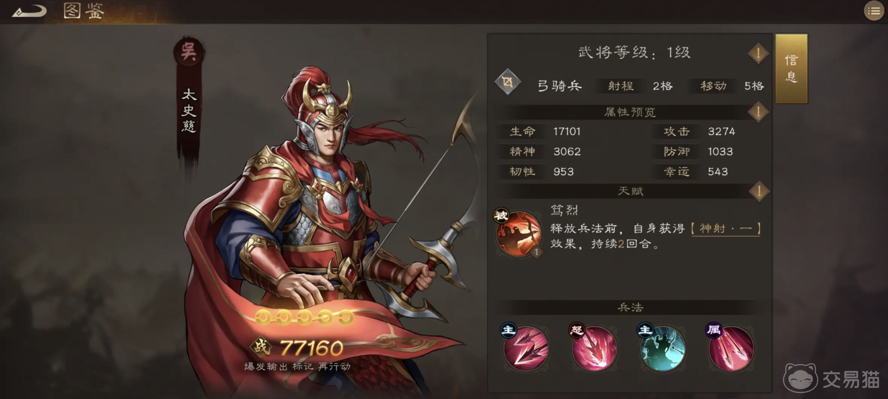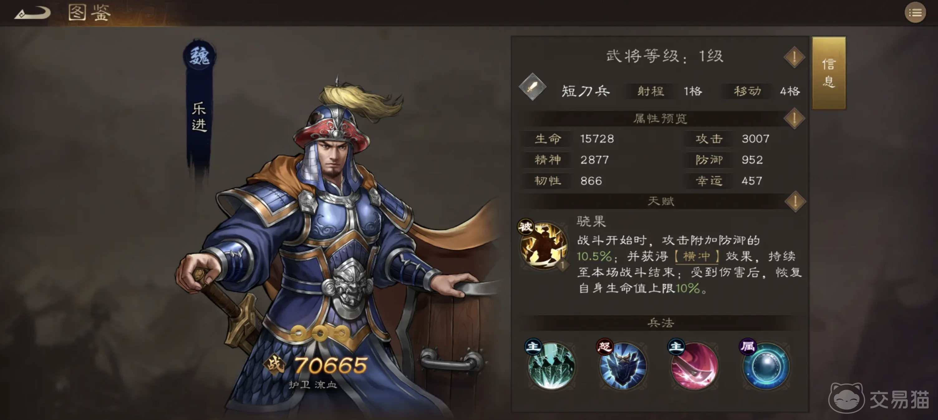 前期肉盾也很关键,推荐使用紫将乐进。虽然是紫卡,但非常耐打,挨打能回血,只要不是被秒,基本打不死,是前期最适合的“平民战神”,后期还可以把他换成输出位。