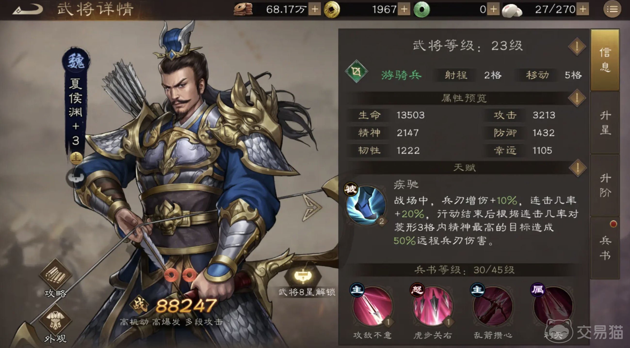 远程输出推荐夏侯渊,夏侯渊的天赋可以增加兵刃伤害和连击率,并在行动后对敌人附加一次远程打击,不仅清怪快,对武将也有一定威胁。夏侯渊获取方便,观星台可指定抽取,比黄忠和太史慈更适合平民使用,是稳定的后排火力点。