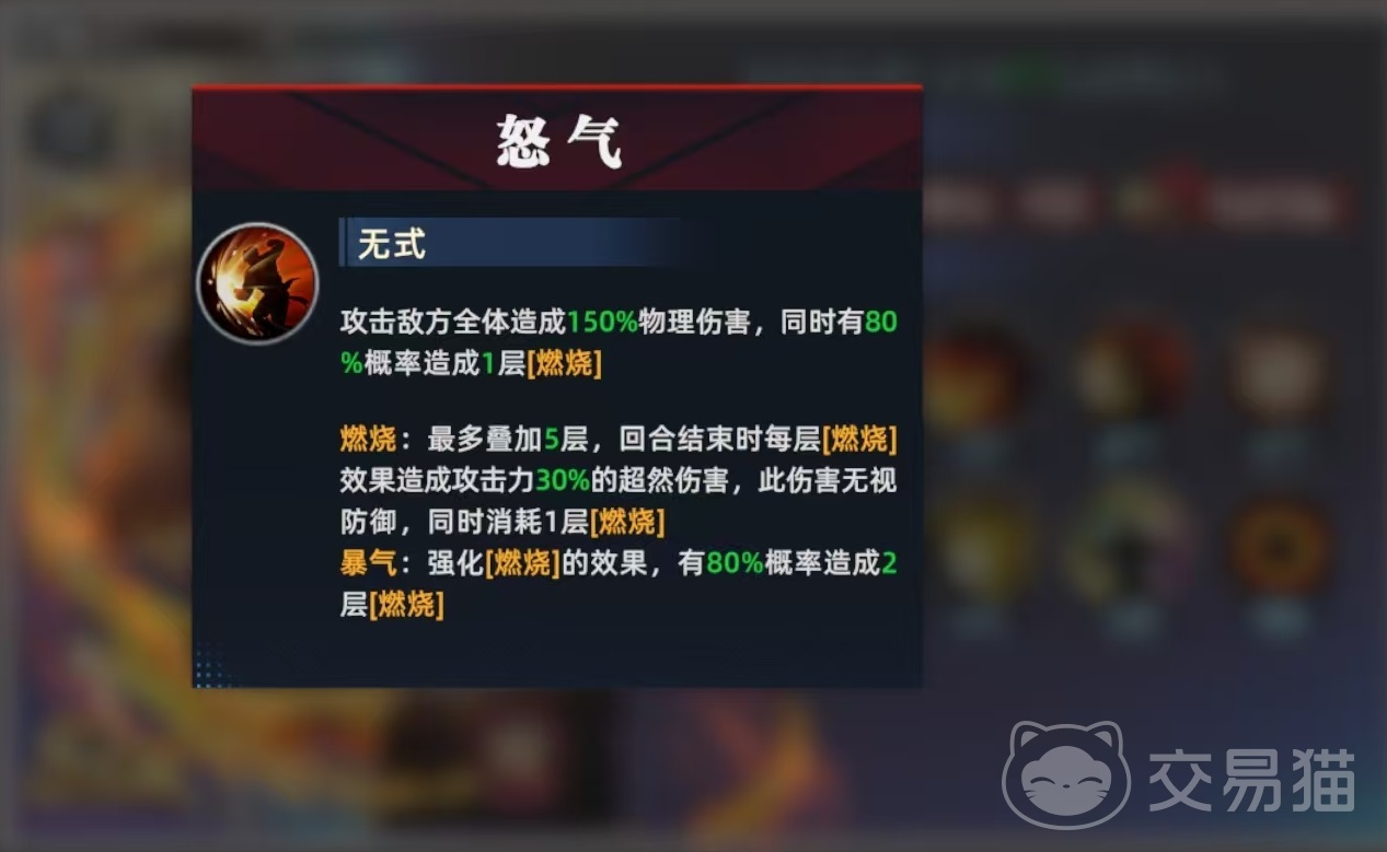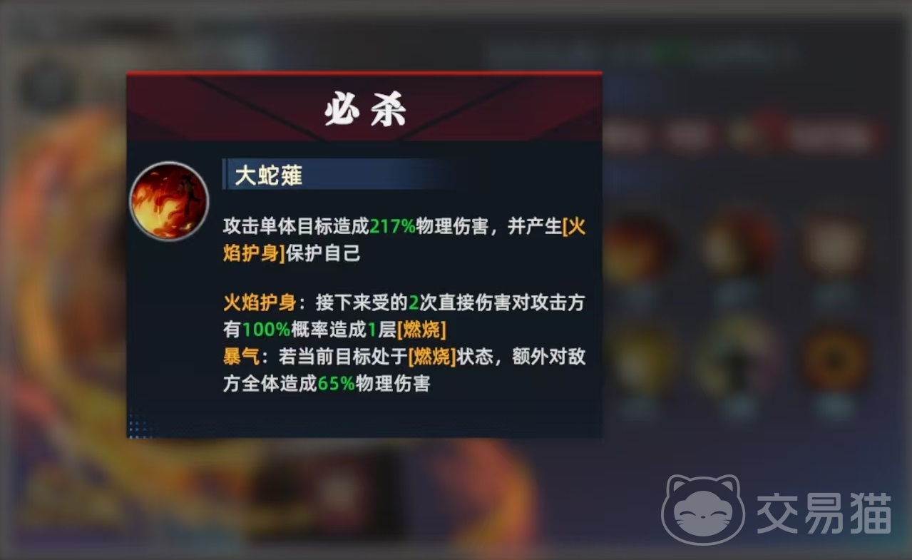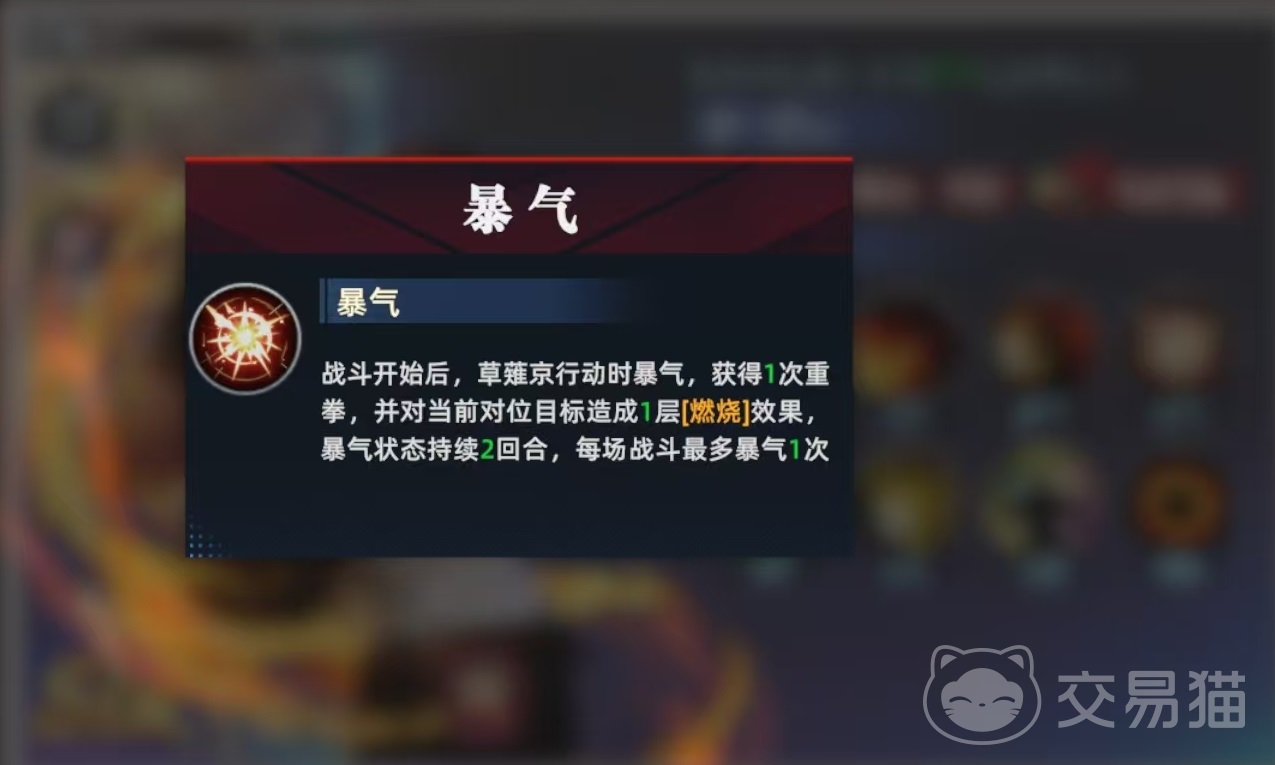 在技能方面,必杀技效果是攻击单体目标,造成高额物理伤害后,获得火焰护身保护自身。在火焰护身的影响下,接下来受到的两次直接伤害,会对攻击目标造成一层燃烧。在爆气的状态下,如果输出目标处于燃烧状态,那么额外对敌方全体造成一次物理伤害。也就是如果是带有燃烧状态的目标来攻击草薙京,并且草薙京处于暴气状态下,那么对方全体就会受到一次输出。