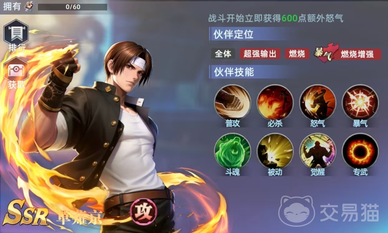 草薙京是属于SSR品质的攻击型选手,自身的定位是具有超强输出,还具有燃烧以及燃烧增强的额外效果。战斗开始时可立即获得600点额外怒气,所以短回合内就能打出很高的爆发输出。自身的爆气在战斗开始,行动时直接就能触发,获得一次重拳,并对当前的对位目标造成一层燃烧效果,爆气状态持续两回合。这样的爆气就和其他角色有所不同,开局即爆发。
