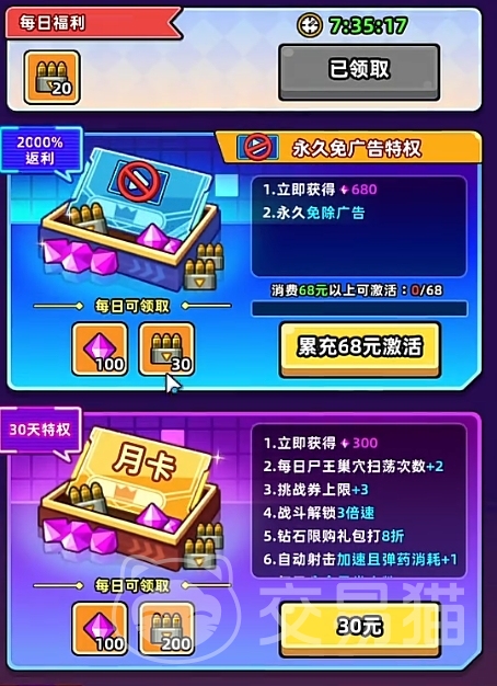 其次是月卡了,月卡是30元/月。通过月卡能增加玩家每日能扫荡副本的机会以及各类养成道具,同时月卡充值金额会累计,达到累计充值68元的话能永久免除广告特权,这样的话玩家在刷新机宠的时候就能跳过看广告直接刷新了。