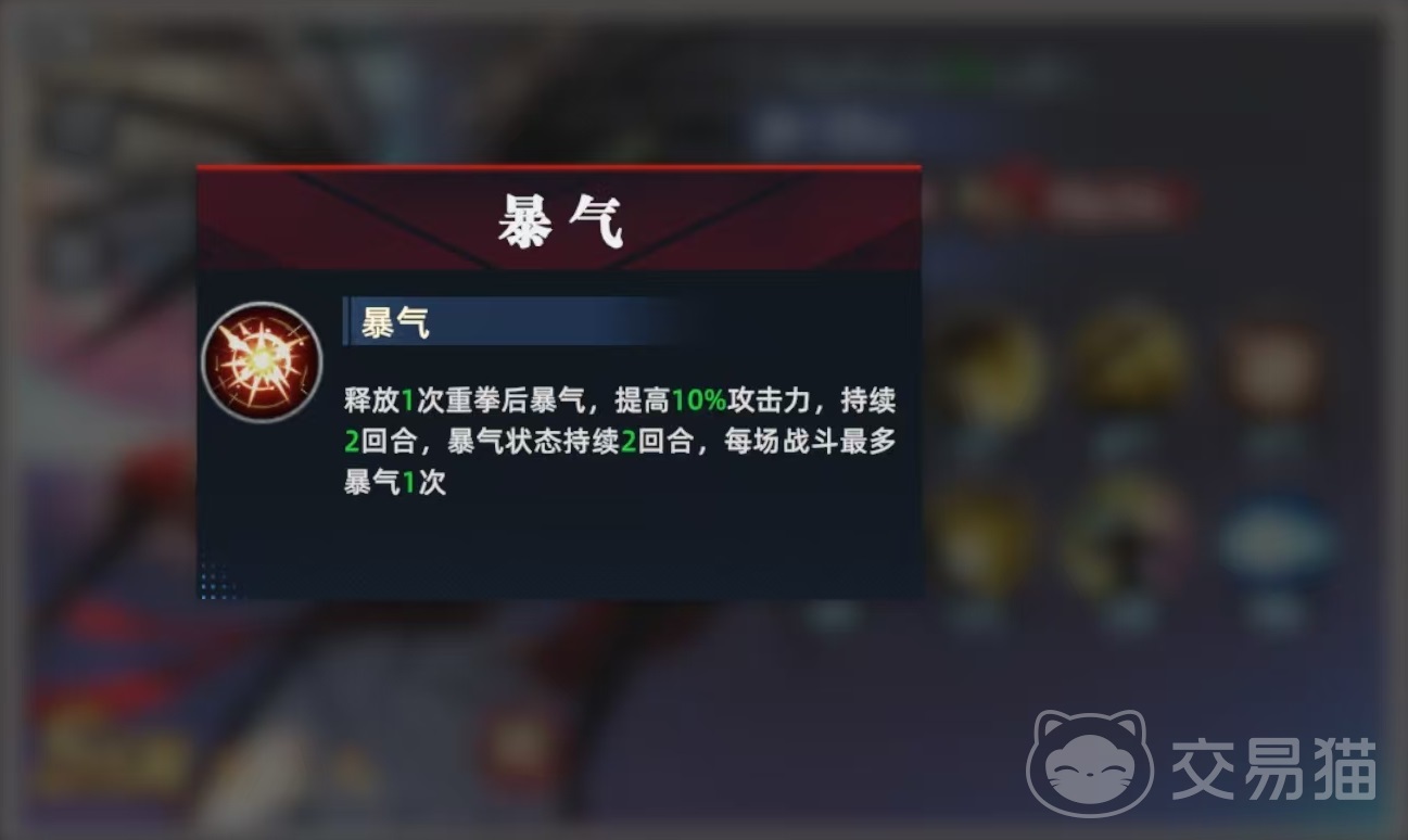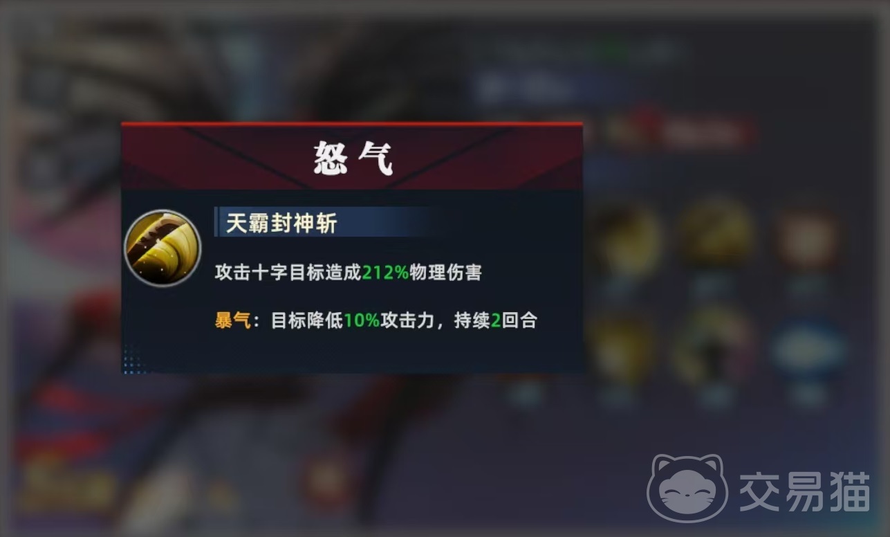 怒气技能天霸封神斩,攻击十字目标,造成高额物理伤害,在爆气状态下,能额外降低目标10%的攻击力,持续两个回合。这就要求大家在使用技能的时候,尽量让更多的敌人处于攻击范围之内,这样的伤害才会更高。霸王丸的斗魂效果是每次轻拳,都能获得200点怒气,这样的特点使得霸王丸可以更加频繁地使用出怒气技能,所以战斗中的输出效率非常高。被动效果通过提升星级,可以增加暴击、最终伤害、强化重拳效果,使重拳有很高概率降低目标的怒气,并提高自身的暴击伤害。