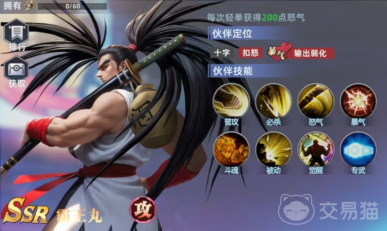 霸王丸在游戏中的定位是属于出色的攻击型选手,必杀技效果是攻击当前的单体目标,造成一次高额物理伤害,在爆气状态下有额外暴击伤害加成。自身爆气效果,在释放一次重拳后可以触发,爆气提高10%攻击力,持续两回合,爆气状态持续两回合,在每场战斗中最多爆气一次。