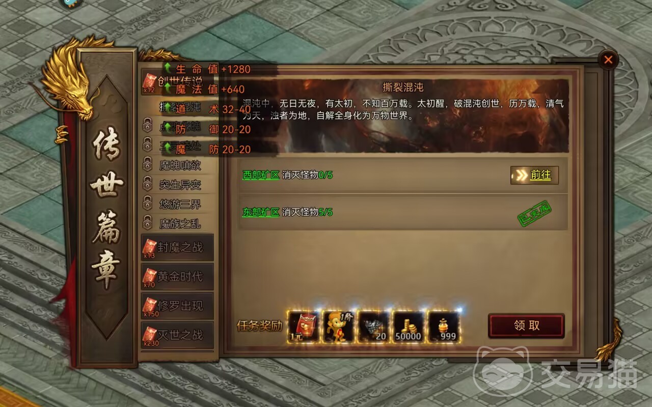 这里的战役模式其实就是一种挑战,刚开始的挑战叫做创世传说。这里要求大家前往创世的矿区当中消灭对应类型的怪物,消灭十个就可以完成并领取了。不过期间大家要是找不到路的话也可以直接点击前往,就能够自动带大家去寻找这些怪物。