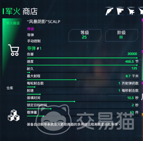 风暴阴影:初始的伤害数值是2万,速度可以达到466.5节。如果是在满级的状态下就可以造成26,000的伤害,装填的时间是7.3秒。