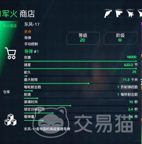 东风 17:这一个导弹的实力还是很出色的,整体就可以造成的伤害数值为18,000,速度可以达到622,如果是在满级的状态下,那所造成的伤害数值就可以达到23,400。装填的时间是七秒,整体的实力还是比较出色的。