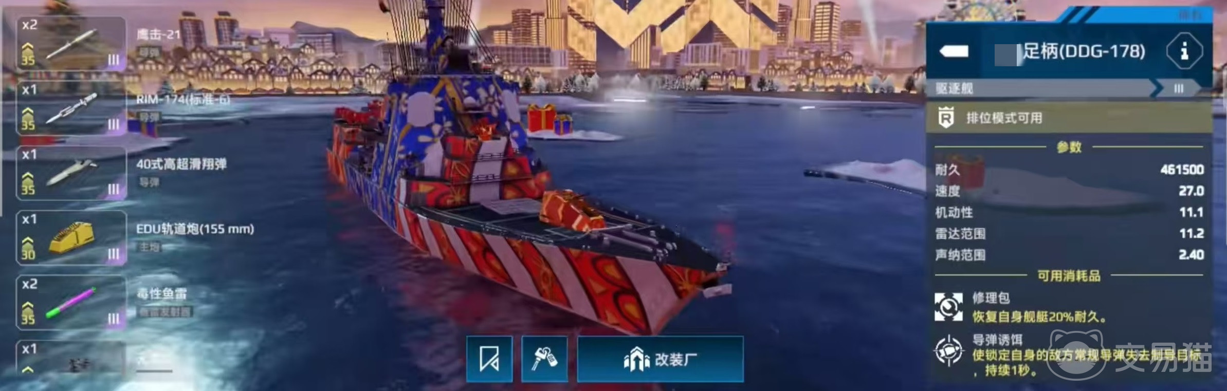 武器配置方面是足柄的亮点,自身在导弹上1号导弹槽装备了鹰击21,另一个导弹槽是标准6,可以选择40式高超音速滑翔弹。主炮采用的是155毫米轨道炮,这样在实战中有着一定的火力输出能力。装备的鱼雷也比较优秀,可以对敌方舰艇造成有效打击。防空武器方面相对较弱一些。自身携带的直升机槽可以用无畏,这个直升机能够使用机载导弹诱饵干扰对方导弹。