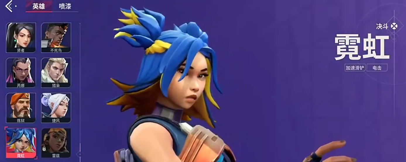 霓虹也是决斗,她的“充能疾驰”会立刻提升自己的移动速度,并在期间继续充能,充能结束时按滑铲按钮,可以发动闪电滑行,她的“通道”会发射2道能量线并前延伸一段距离,能量线在随后会变成能阻挡视线的电墙,她的“闪电弹球”会立刻抛出一个能量箭,并反弹一次,每次击中物体时会造成震荡冲击,并使其下方的地面通电,她的大招会在释放出自己全部力量与速度,在这个期间按射击键可以用她的力量,发射出快且精准的闪电光束。