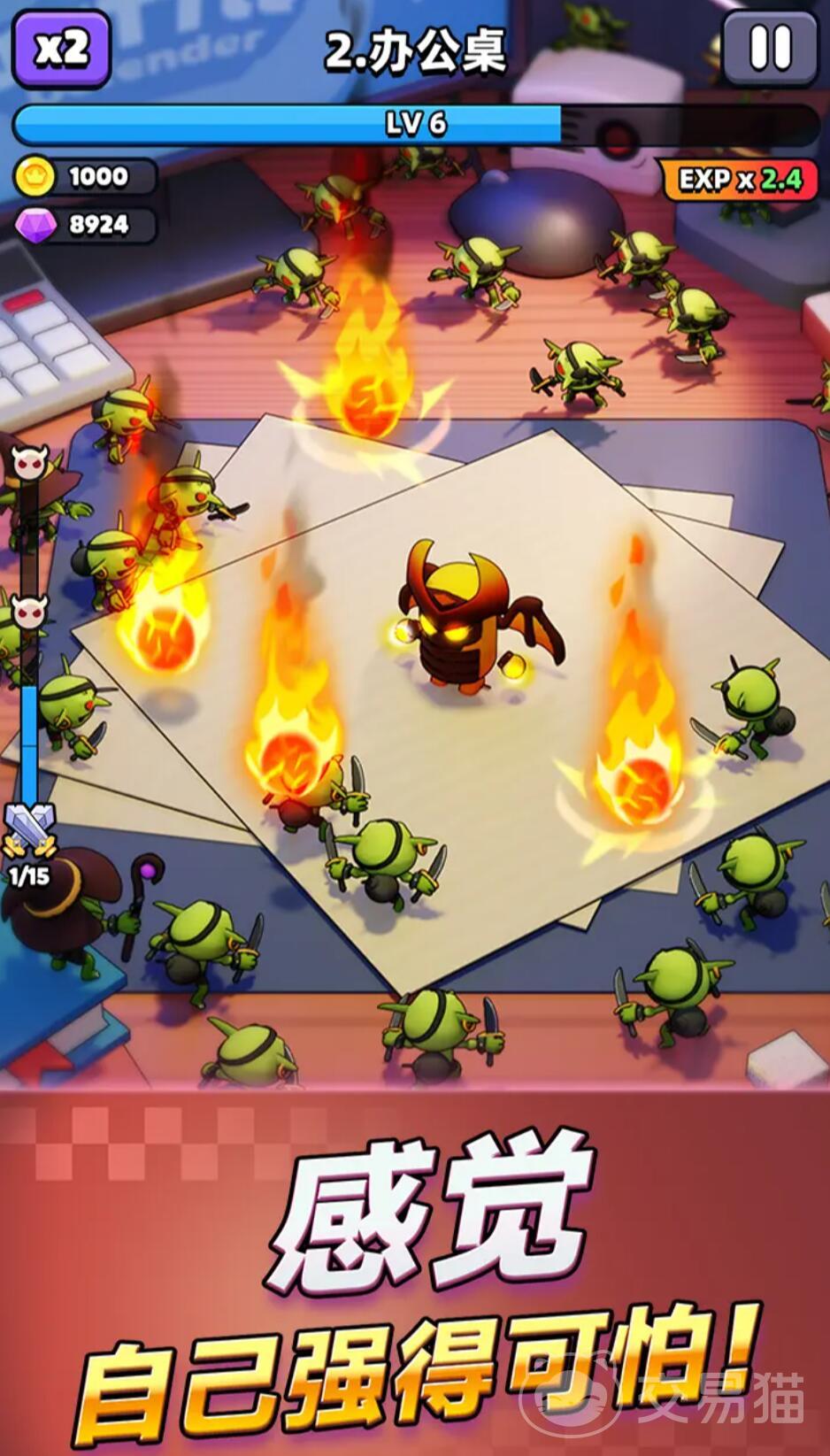 游戏采用中心塔防机制,玩家开局选择两名英雄驻守地牢中央,英雄自动攻击四面来袭的敌人。战斗中击败怪物积累经验可触发Roguelike式技能升级——随机三选一强化现有技能或召唤新英雄加入,最多组成五人小队。技能升级设计独特,同类技能强化三次可引发质变,大幅提升伤害与攻击范围,再配合20波怪物+多轮BOSS战的紧凑节奏,形成“轻松操作+高策略性”的独特体验。