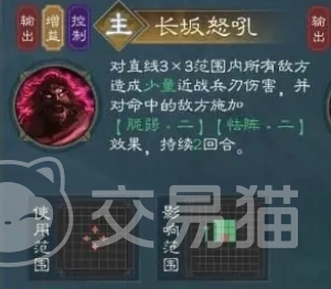 张飞的主动技能长坂怒吼,可谓是集输出、控制与增益于一体的强大技能,激活该技能后,能够对直线3x3范围内的所有敌方目标造成少量的近战兵刃伤害,在群体攻击的叠加下,技能还会对命中的敌方施加脆弱和怯阵这两种负面效果,且这两种效果都能够持续2回合,脆弱会使敌方的防御降低30%,让己方后续的攻击能够更加轻易地对敌人造成伤害,而怯阵则会降低敌方15的暴击抗性,使得己方的攻击更容易触发暴击。