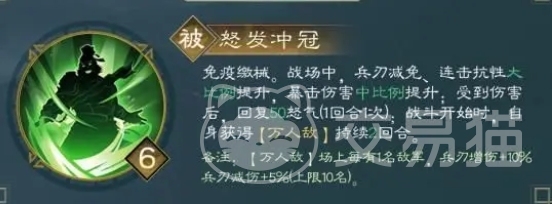 再来说说张飞的天赋被动怒发冲冠,这一天赋赋予了他免疫缴械的强大能力,在战场上让他能够更加从容地应对敌人的控制技能,同时在战斗中,他的兵刀减免属性以及连击抗性都会得到大比例的提升,暴击伤害也会有中比例的增强,而且在受到伤害后,他还能够回复50怒气,当然是1回合仅限1次,这一特性保证了他在战斗中能够持续地保持作战能力,值得一提的是在战斗刚刚开始时,张飞自身就会获得万人敌这一强力效果,且该效果能够持续2回合,万人敌的效果是只要场上每存在1名敌军,他便能获得10%的兵刃增伤以及5%的兵刃减伤,上限为10名敌军,这使得他在战斗初期就能够迅速建立起战斗优势。