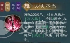 再看张飞的怒气技能万夫不当,这是一个群体性质的强大技能,使用时会消耗200怒气,首先会对自身施加万人敌效果,且该效果能够持续3回合,进一步提升自身的战斗能力,随后会对自身周围一圈范围内的所有敌方造成中量的近战兵刃伤害,对范围内的敌人进行群体打击,更为厉害的是对于被暴击的敌方,还会额外施加混乱效果,该效果会使敌方失去全部操作能力,只能随机移动。