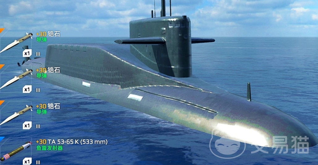 台风级核潜艇,也是一个水下巨无霸,作为全球最大核潜艇,承载着俄罗斯海洋霸权的威严,它以15节航速破浪前行,血量高达19万5000,氧气储备260虽稍逊北风之神,却也足以支撑长时间潜行,其火力配置也很高,导弹卡槽多的是,更能连续发射两枚鱼雷,瞬间爆发的火力风暴远超北风之神,虽说速度不算顶尖,可凭借这碾压式的打击威力,是PVE副本与挂机收益场景里的强势潜艇。