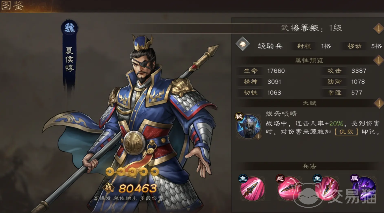 夏侯惇属于摧锋锐骑,有着高机动性能在战场上来去自如对敌军后排造成致命伤,他的天赋是出于战场时让自己的连击几率、兵刃伤害减免都得到提升,并在每次遭受伤害时,会对攻击者施加仇敌,自身与敌人移动力每相差一格,就让自身兵刃伤害少量提升,有仇敌标记的目标会在后续夏侯惇用技能攻击时额外造成80%伤害,他的“勇战血恨”会造成大量近战兵刃伤,并有概率额外追加一次攻击,释放该技能会临时提升自己连击率;