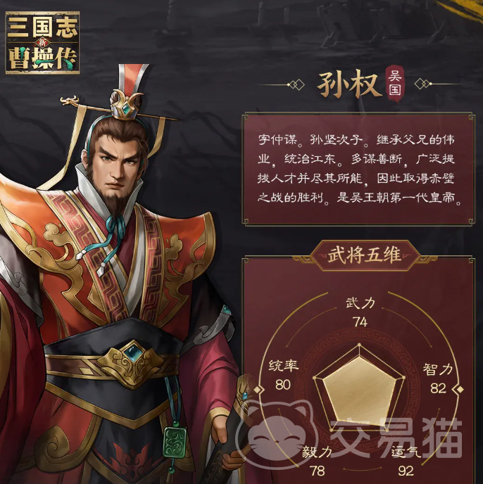 孙权是不被任何兵种克制的霸王,拥有大范围输出和团队增益,他的天赋是让自己的生命上限、格挡概率和暴击抗性提升,让全体队友暴伤免伤上升,同时在每回合开始时对自身菱形范围的地形施加虎啸一回合,处于虎啸内的队友全属性都会提升,他的“割据江东”会造成大量输出,并对自己和所有地形上的队友施加提升伤害减免和格挡概率的虎威,他的“开疆扩土”会对菱形3格范围内敌人造成谋略伤,并对地形施加虎啸3回合,他的怒气技会对范围内敌人造成近战兵刃伤后,施加流血、焚烧和弱袭,流血和焚烧都会让中招者在之后遭受每回合一次的真伤,弱袭会让暴击率降低15%。