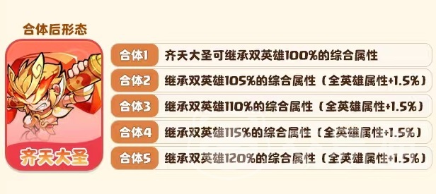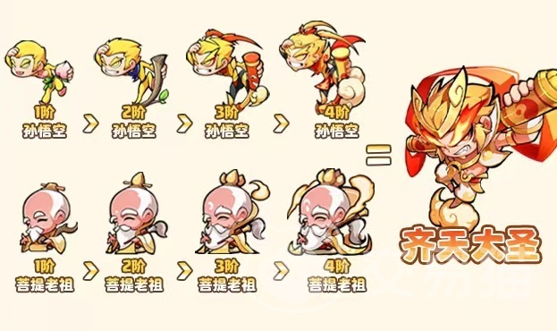 齐天大圣具有非常强的额外增伤效果,输出极为给力,自身的合体路径需要孙悟空和菩提老祖合成得到。孙悟空和菩提老祖都需要培养到四阶,然后放到一起,就能得到齐天大圣了,主要技能有三个,分别是棍花、潜能觉醒和断筋。