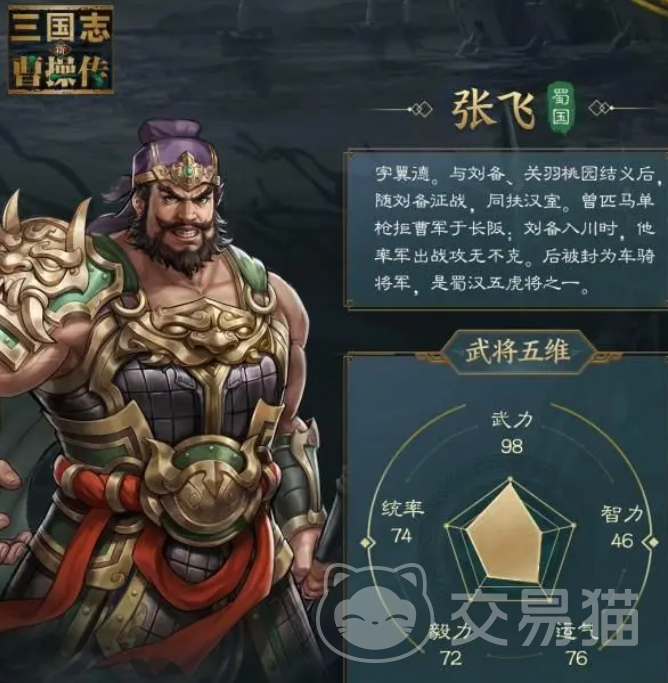 张飞是在任何地形都不减少攻击的贯阵枪兵,他的天赋是让自己的连击抗性、暴击伤害和兵刃减免在战场上得到提升,每次遭受伤害会回复50点怒气,他的“长坂怒吼”能对范围内所有敌人形成少量的伤害,并对命中到的目标施加“脆弱”和“怯阵”,脆弱会让防御下降30%,怯阵会让暴击抗性降低15%,他的“万军取首”能对攻击目标造成大量近战兵刃伤害,并回复本次伤害一定比例的生命,他的怒气技会对自己施加万人敌3回合,对范围内敌人造成伤害,并对被暴击命中的施加1回合混乱,万人敌能在场上每有一名敌军的情况下,提升自己10%兵刃增伤和5%减伤。