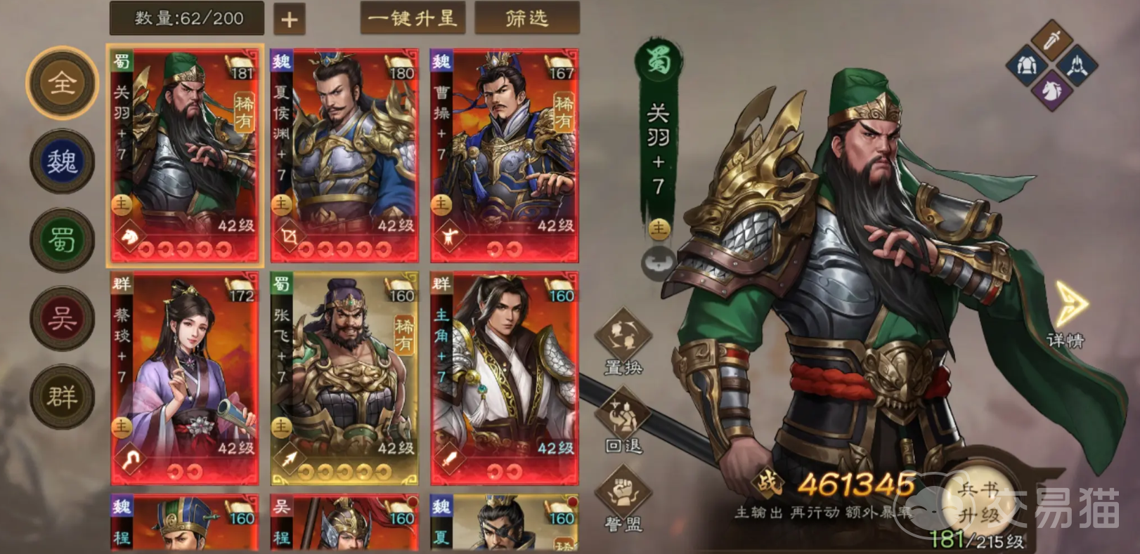 关羽的兵种是玄甲重骑,属于全副武装的骑兵,能有效抵挡箭矢伤害,他的天赋是在战斗开始时让自己在2回合内攻击力上升,并在战场上让自己的暴击概率大幅提升,暴击伤和连击抗性小幅度提升,若是成功造成暴击或是击杀敌人,还能再次行动,他的“青龙突斩”会对前面3格范围内的所有敌人造成中量近战伤,同时自身向前突进相同距离,若范围内只有一位敌人则该伤害必定暴击;